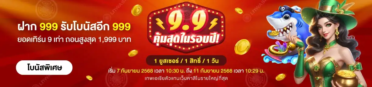 9.9 คุ้มสุดในรอบปี! เพียงฝาก 999 บาท รับโบนัสอีก 999 บาท! โบนัสพิเศษมอบให้เฉพาะสมาชิกเทพเอเชีย ยอดเทิร์นโอเวอร์เพียง 9 เท่า ถอนได้สูงสุด 1,999 บาท สมาชิก 1 ยูสเซอร์ รับ 1 สิทธิ์ต่อ 1 วัน เฉพาะเกมสล็อตและยิงปลาจีคลับ