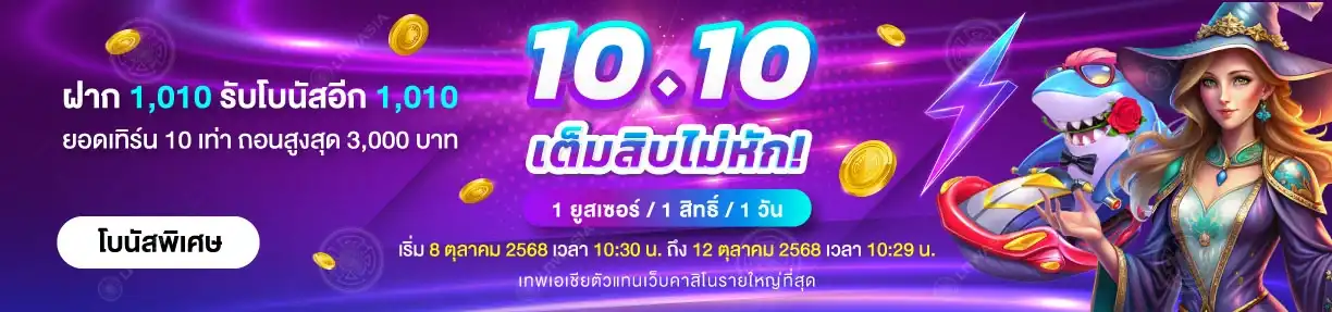 10.10 เต็มสิบไม่หัก! ฝากเพียง 1,010 บาท รับโบนัสอีก 1,010 บาท! โบนัสพิเศษมอบให้เฉพาะสมาชิกเทพเอเชีย ยอดเทิร์นโอเวอร์เพียง 10 เท่า ถอนได้สูงสุด 3,000 บาท สมาชิก 1 ยูสเซอร์ รับ 1 สิทธิ์ต่อ 1 วัน เฉพาะเกมสล็อตและยิงปลาจีคลับ