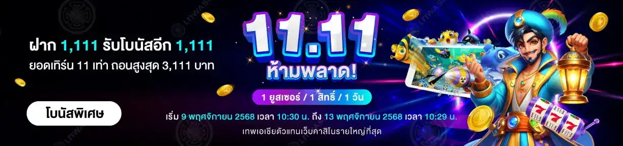 11.11 ห้ามพลาด! ฝากเพียง 1,111 บาท รับโบนัสอีก 1111 บาท! โบนัสพิเศษมอบให้เฉพาะสมาชิกเทพเอเชีย ยอดเทิร์นโอเวอร์เพียง 11 เท่า ถอนได้สูงสุด 3,111 บาท สมาชิก 1 ยูสเซอร์ รับ 1 สิทธิ์ต่อ 1 วัน เฉพาะเกมสล็อตและยิงปลาจีคลับ